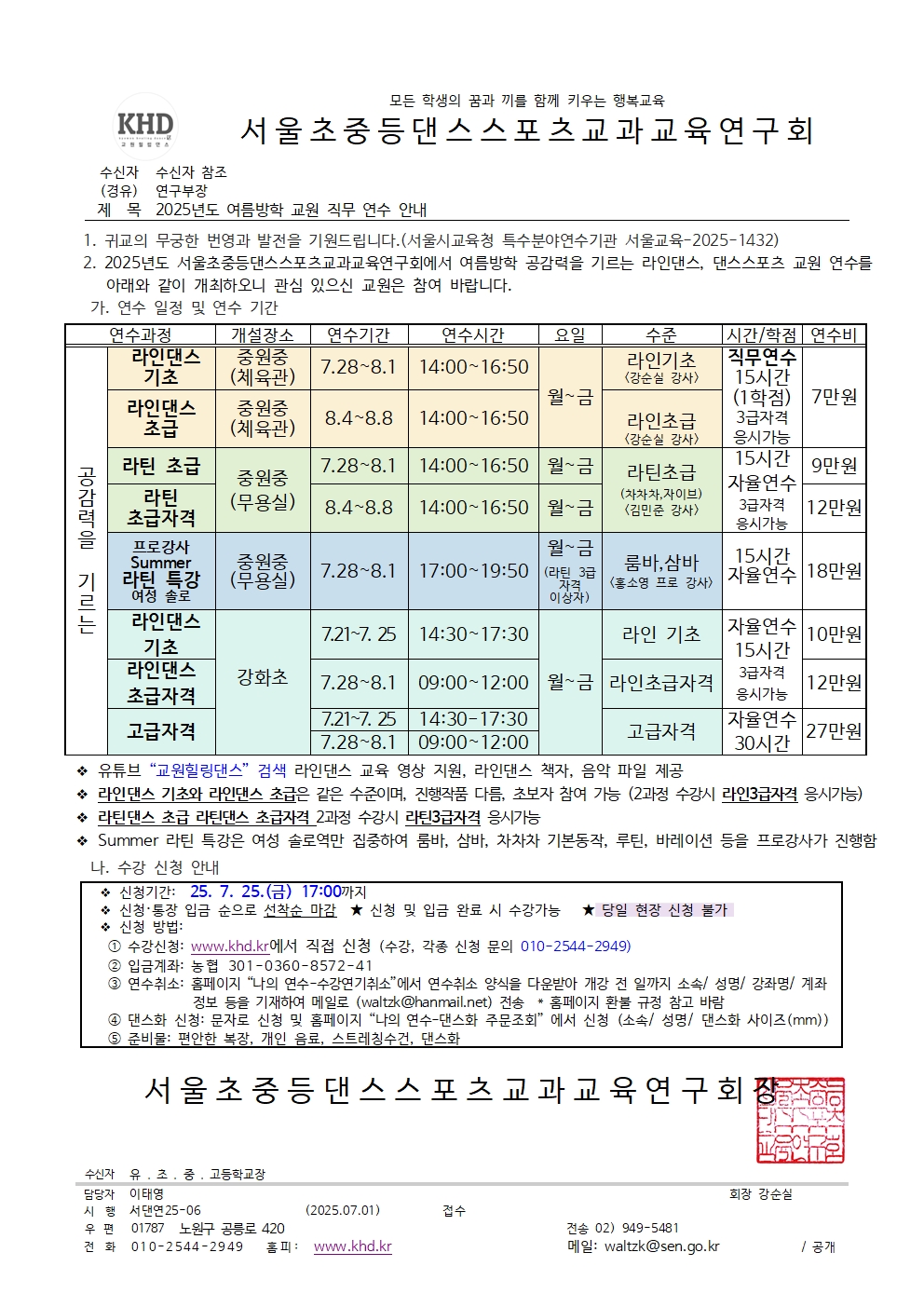 2025 여름방학 교원연수 안내 합니다. 댄스와 함께 활기찬 방학 보내셔요